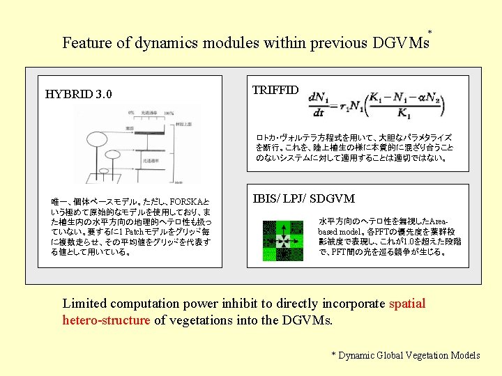 Toward developing the land surface model Land surface physical process model Land surface carbon cycle model Vegetation dynamics model For simulating long time scales, vegetation dynamics model must be added to predict changes in vegetation distribution 原図:伊藤昭彦