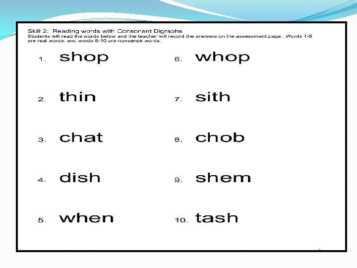 Decoding It is the process of using letter sound correspondences to recognize words. An assessment that examines a student’s decoding skills looks at a child’s reading accuracy. One example of this type of measure is to present a students with some words and ask them to read each word aloud. Also students can be asked to read phrases, simple sentences or short stories.