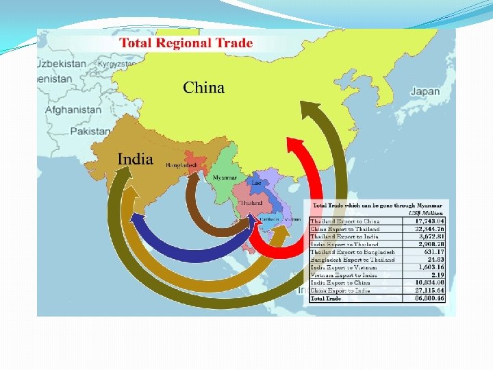 UNION OF MYANMAR § § § § § Myanmar is the largest country on mainland South-East Asia with a total land area of 676, 577 sq. km Total coastline is 2, 832 km. Shares total international borders of 5, 858 km Bangladesh and India on the north-west, China on the north-east and; Laos and Thailand on the south-east. Dynamic crossroad linking South East Asia, Western China (Yunnan) and the Indian sub-continent Economic gateway to a potential vast market of over two billion consumers as well as sub-regional economic nodal link. Population around 56 Million