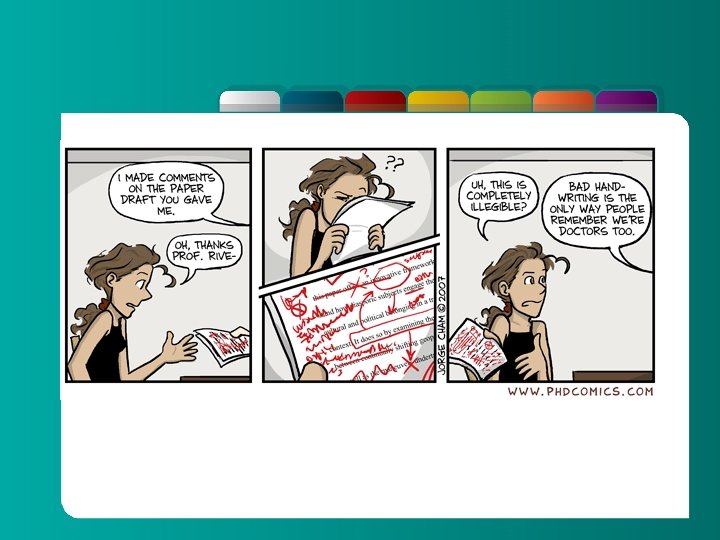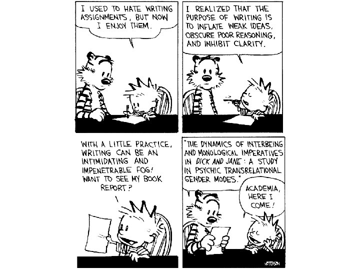 What can we learn from this cartoon? • Academic writing should aspire to simplicity and coherence When something can be read without effort, great effort has gone into its writing ~ Poncela • Writing is a practice – it is something acquired and developed. It is not a skill that is inherent. • Where and how do you develop student writing? If we fail to set aside time for getting the work of writing done, then we send the message that we don’t value the work ~ Badenhorst