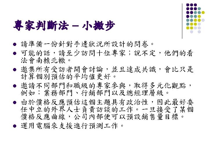 Determining Demand l Influence of the Internet on price sensitivity l l The Internet has increased customers’ price sensitivity, e. g. mysimon. com, 手機王. Mckinsey’s study found that there is less pricecomparison shopping taking place on the Internet than is possible: 89% (book), 84% (toy) and 81% (music).