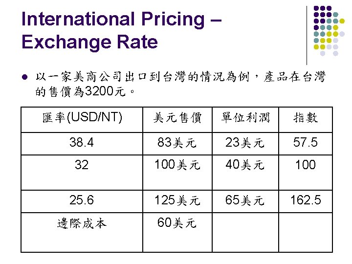International Pricing – Exchange Rate 匯率變動與價格調整實例(1986年 1月至 1987年 1月) 產品 精 錶 Sony隨 身聽 Canon 相機 BMW 528 匯率變 價格變 動 動 -24% +13. 5% -24% +20. 0% -24% +14. 6% -25% +7. 8%