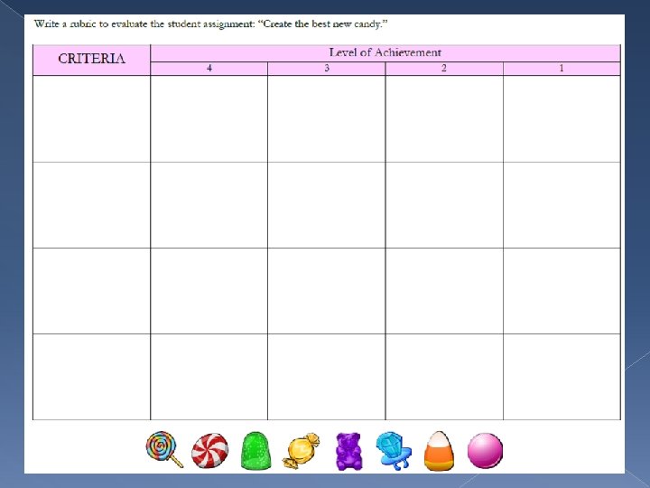 Rubric Writing Exercise � You are faculty members at the Maryland Institute of Culinary Arts. You’ve been asked to create a rubric for your Confections course. › Student assignment: “Create the best new candy. ” › Rubric: Must measure 4 criteria, with 4 levels of achievement for each.