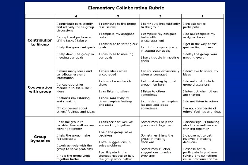 Example of a Learning Rubric (Brookhart, 2013) Group Participation (Process Criterion) [Levels of Quality for Student Self-Assessment] Criteria 4 3 2 1 1. Goalsetting and focus I helped set my group’s goals and helped keep the group focused. I helped set my group’s goals and stayed focused on them. I accepted the goals that other group members set. I resisted the goals we set and got the group off-task. 2. Personal contributi on I contributed something very important to our work. I contributed something to our work. I didn’t contribute to our work, or I did contribute but the group made me do it. 3. Attention I listened to other group members and responded in a helpful way. I listened to other group members. I talked to much or didn’t listen to other group members. I distracted the group by what I said and did.
