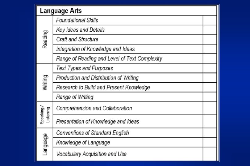Example: Language Arts 1. Reading: Text complexity and the growth of comprehension 2. Writing: Text types, responding to reading, and research 3. Speaking: Flexible communication and interpersonal skills. 4. Listening: Integrate information and evaluate what is heard 5. Language: Conventions,