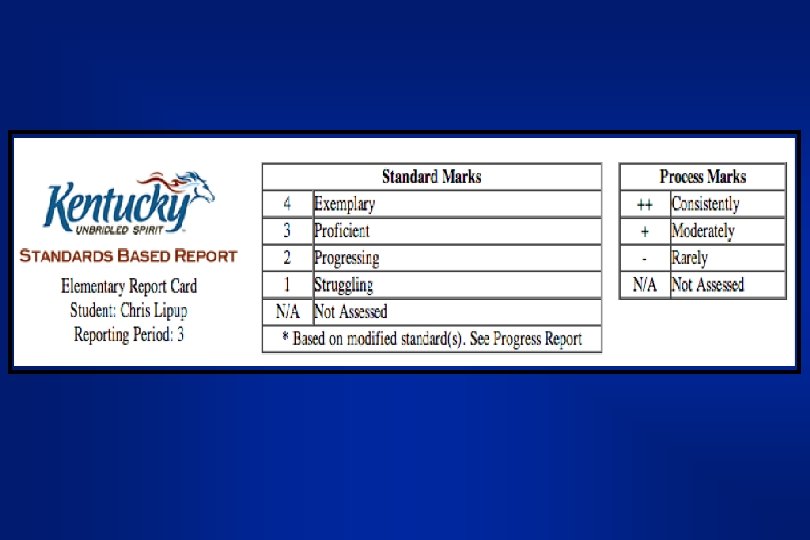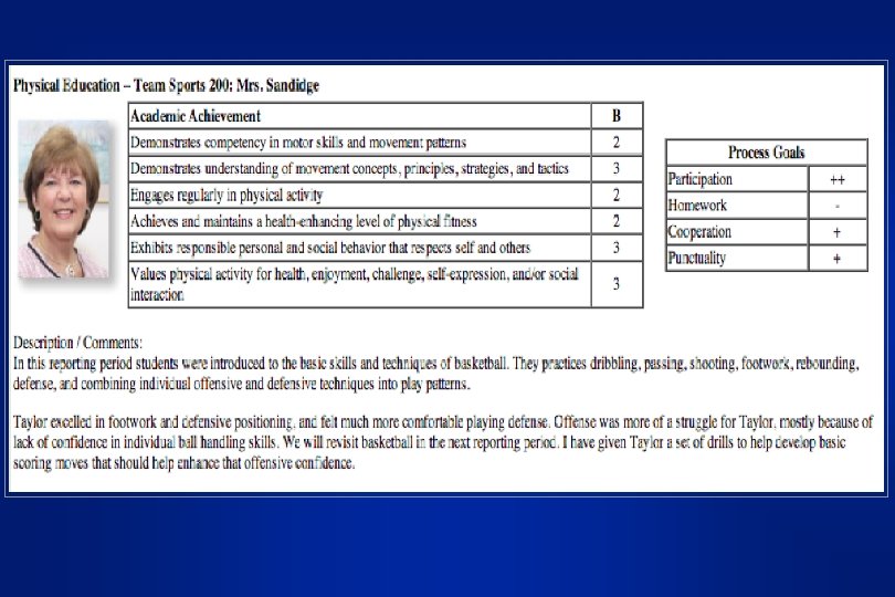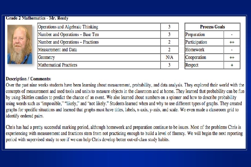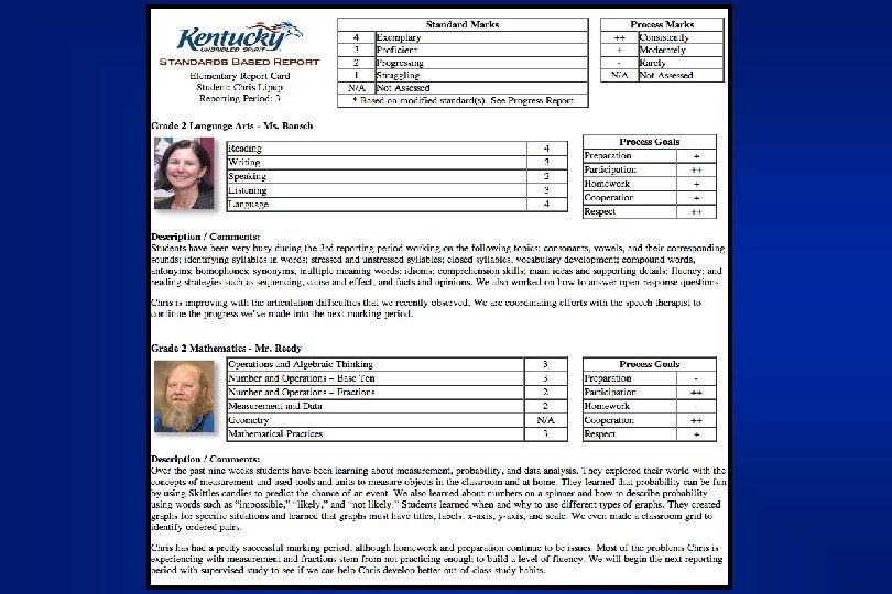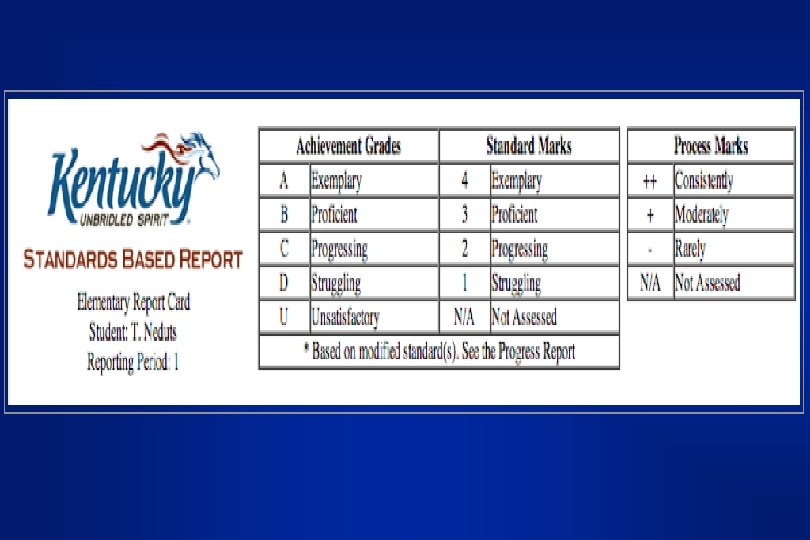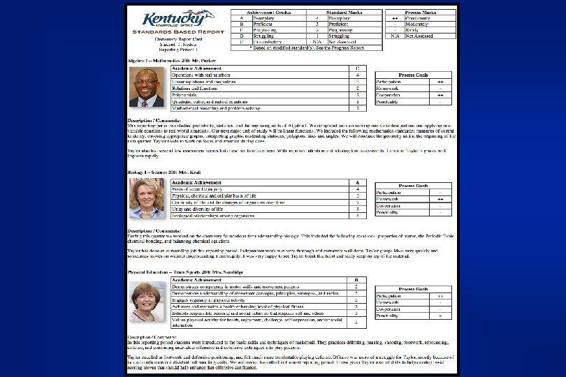 Typical Development Process 1. Appoint a “Report Card Committee. ” 2. The Committee meets to discuss problems and concerns. 3. Committee members search the Internet for examples from other schools/districts. 4. Committee members review examples, chose what they like, and combine elements to create a “hybrid” report card.
