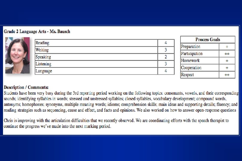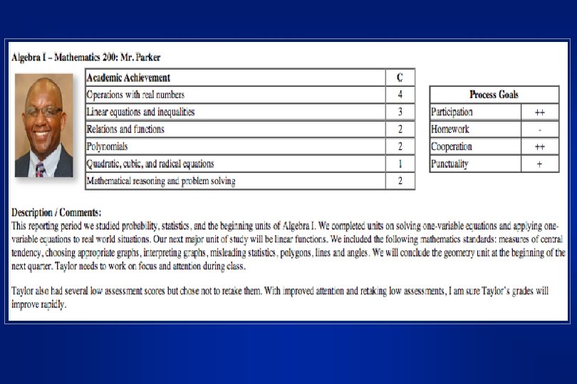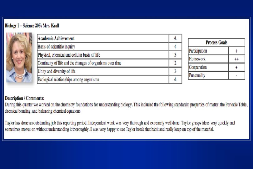 #3 Example of a Purpose Statement: The purpose of this report card is to inform students o teachers’ judgments of their academic performance in e of their classes. Grades reflect how well students have the established learning goals in the class, areas of outstanding performance, and areas where additional e is required.
