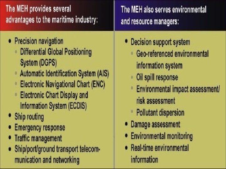 MARINE ELECTRONIC HIGHWAY An innovative marine information and infrastructure system that: enhances maritime services and navigational safety standards; integrates marine environment protection and sustainable development of the coastal and marine resources; and provides a sustainable financing mechanism through public-private partnerships.