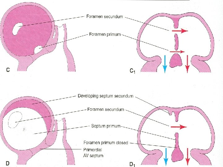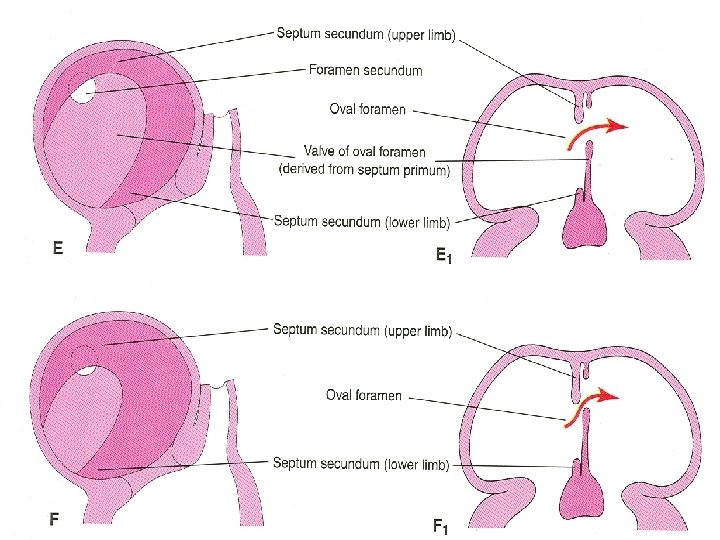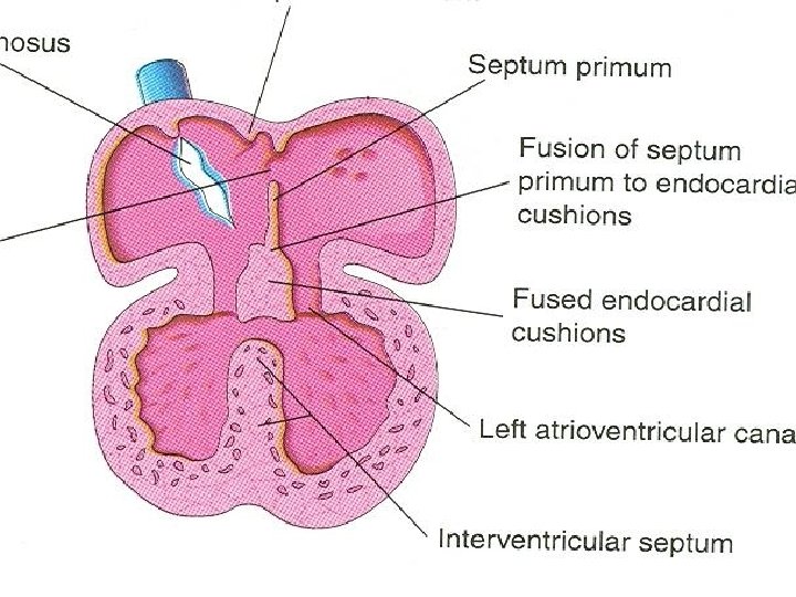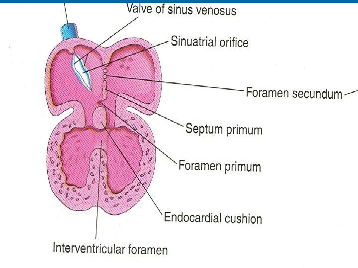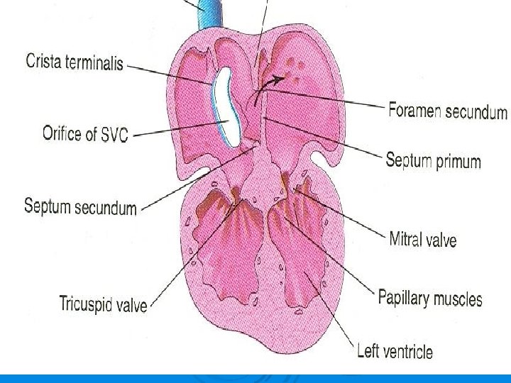Foramen Secondum Ø Perforation appears in the central part of the septum primum before the foramen primum disappears Ø Perforation coalesce to form another opening, the foramen secondum Ø Concurrently, the free edge of the septum primum fuses with the left side of the fused endocardial cushions Ø It ensures a continuous flow of oxygenated blood from right to the left atrium
