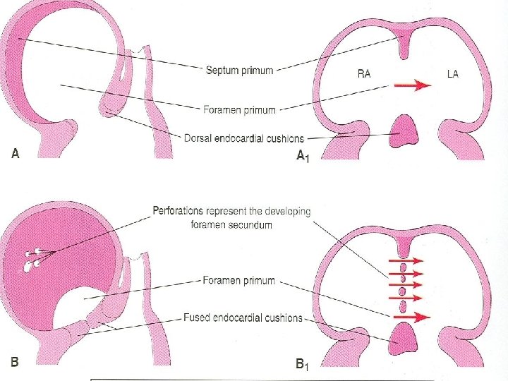 Partitioning of Primordial Atrium Ø Beginning at the end of the 4 th week Ø Is divided into right & left atria by the formation and subsequent modification and fusion of two septa: Ø Septum primum Ø Septum secondum