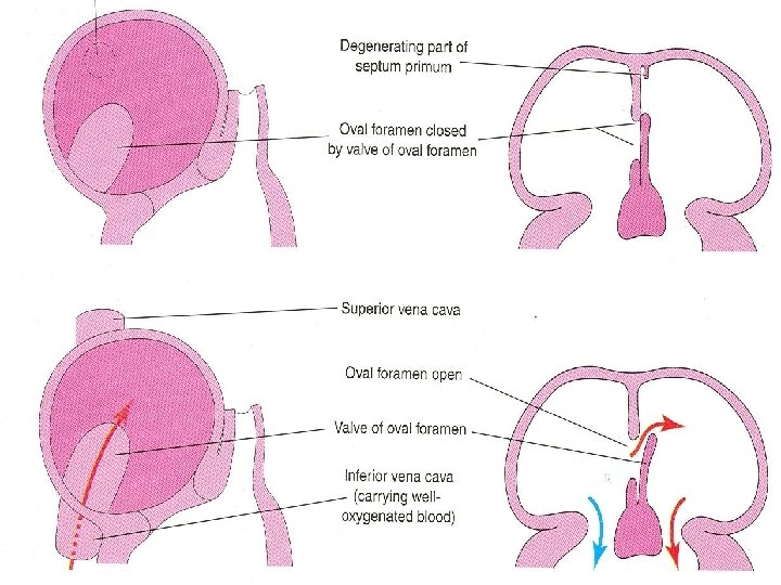 Oval Foramen Ø Before birth it allows most of the oxygenated blood entering the right atrium from IVC to pass into the left atrium Ø Prevents the blood flow in opposite direction Ø After birth it normally closes and the valve of the oval foramen fuses with septum primum Ø The interatrial septum becomes a complete partition between the atria