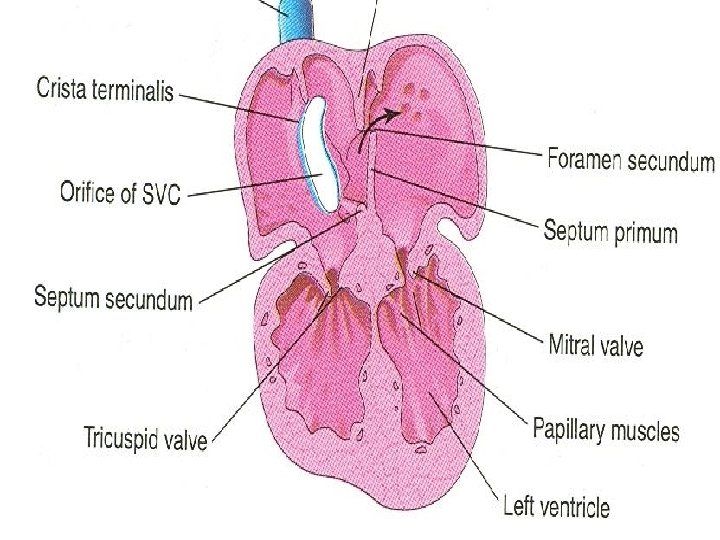 Septum Secondum Ø It forms an incomplete partition between the atria Ø Consequently an oval foramen forms Ø Cranial part of the septum primum ( attached to the roof of left atrium) disappears gradually Ø Remaining part of septum primum (attached to endocardial cushion) forms a flap like valve of oval foramen