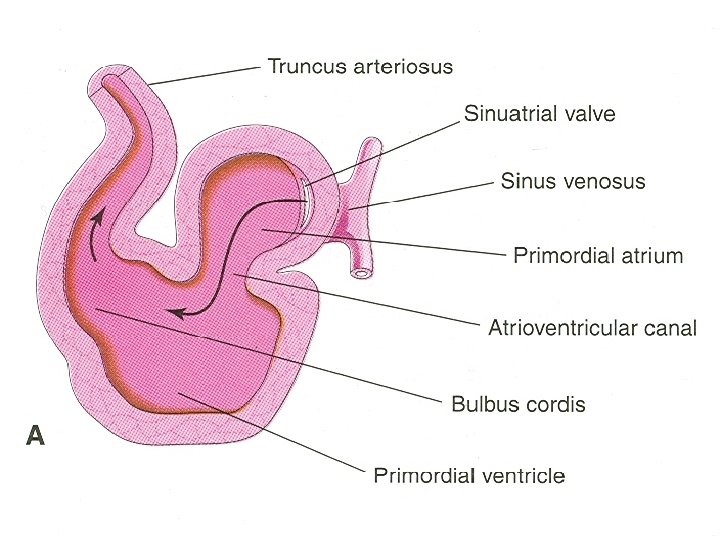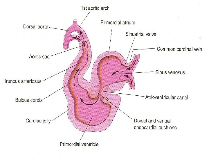 Fate of Heart Tubes Ø The tubular heart elongates and develops alternate dilations and constrictions: Ø Truncus Arteriosus Ø Bulbus Cordis Ø Ventricle Ø Atrium Ø Sinus venosus