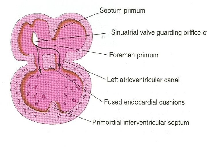 Foramen Primum Ø A large opening forms in the growing septum primum between its crescentic free edge and the endocardial cushion Ø It serves as the shunt, enabling oxygenated blood to pass from right to the left atrium Ø Becomes progressively smaller and disappears as the septum primum fuses with the fused endocardial cushions to form a primordial AV septum