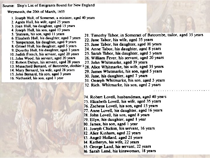 New England • Plymouth - 1620 – (P)ilgrims • • 35 saints 67 strangers Aimed for VA Landed in Cape Cod – Mayflower Compact • Signed before landing • Direct Democracy – Thanksgiving • Food for Smallpox