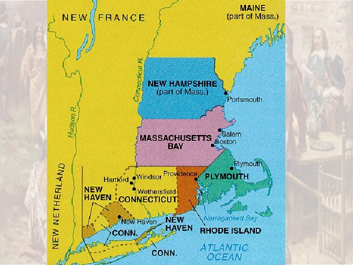 New England • New Hampshire - 1639 – Who: John Wheelright • Follower of Hutchinson – Why: Fleeing Mass. • King Philips War 1675 -78 – King Philip (Metacomet) • Native leader – Final Attempt to expel English – Shows • continued N. A. /Colonist Conflict • N. A. adoption of fire arms