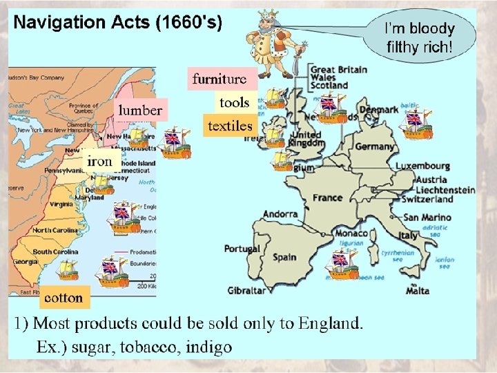 Beginning of the End? • Navigation Acts – Series of laws • All trade must go through England FIRST – Placed on ALL Brit colonies – Begin in the 1650’s/60’s – Renewed/Continued for 200 yrs. • Example: Sugar Act of 1764 • Dominion of New England – 1686 -89 – Attempt to create one big N. E. colony controlled by one English Governor
