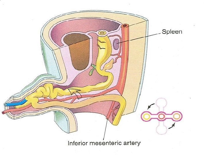 Rotation of Midgut Loop Ø While it is in the umbilical cord the midgut loop rotates 90º counterclockwise around the axis of superior mesenteric artery Ø This brings cranial limb to the right and the caudal limb to the left Ø During rotation the midgut elongates and forms intestinal loops e. g. Jejunum and ileum