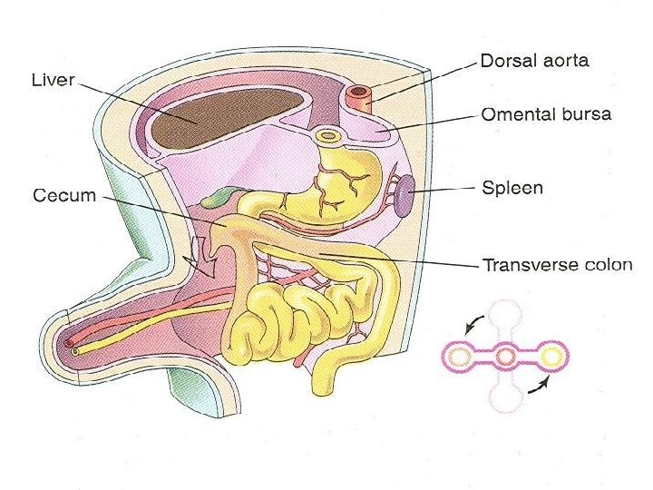 Midgut Ø The cranial limb grows rapidly and forms small intestinal loops Ø The caudal limb undergoes very little change except for development of cecal diverticulum which is a primordium of the cecum and appendix
