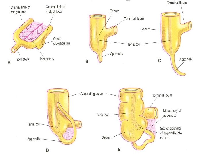 Cecum and Appendix Ø The primordium of cecum and appendix, the cecal diverticulum appears in the 6 th week as a swelling on the antimesenteric border of the caudal limb of the midgut Ø The apex of the cecal diverticulum does not grow as rapidly as the rest of it Ø The appendix is initially a small diverticulum of cecum