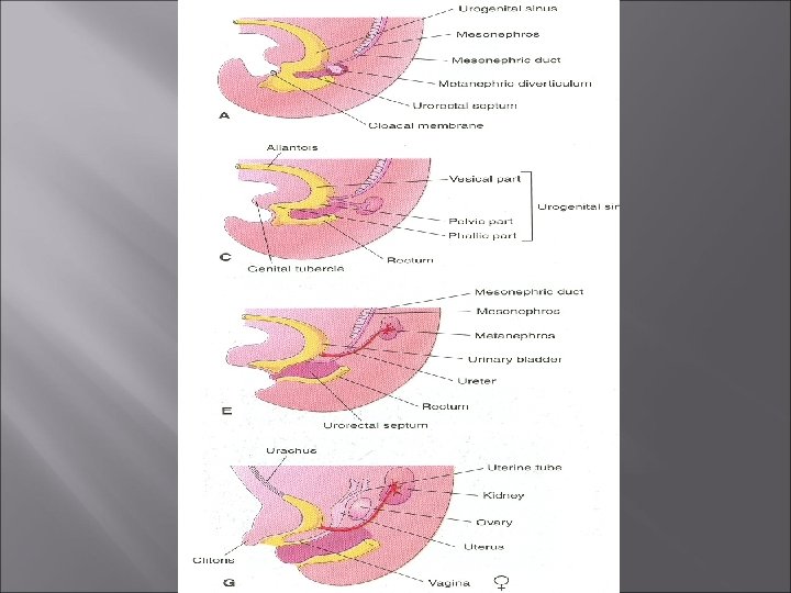 Partitioning of Cloaca Ø The cloaca is divided into dorsal and ventral parts by a wedge of mesenchyme, the urorectal septum Ø It develops in the angle between the allantois and hindgut Ø As the septum grows toward the cloacal membrane , it develops forklike extensions that produce infoldings of the lateral walls of the cloaca