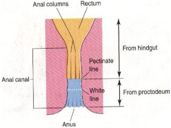 Anal Canal Ø The superior two-thirds of the adult anal canal is derived from the hindgut Ø The inferior one-third develops from the proctodeum Ø The junction between the epithelia of the two parts is indicated by the irregular pectinate line Ø This line is located at the inferior limit of the anal valves Ø It indicates the former site of anal membrane
