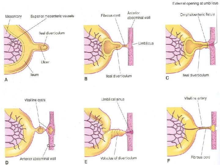 Meckel Diverticulum Ø It arises from the antimesenteric border of the ileum 40 to 50 cm from the ileocecal junction Ø It may be connected to the umbilicus by a fibrous cord or an omphaloenteric fistula