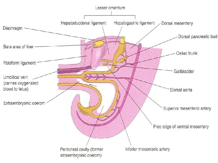 Midgut Ø At this stage the intraembryonic coelom communicates with extraembryonic coelom at the umbilicus Ø This movement of the intestine is a physiological umbilical herniation Ø It occurs at the beginning of the 6 th week Ø The midgut loop communicates with the yolk sac through the narrow yolk stalk or vitelline duct until the 10 th week