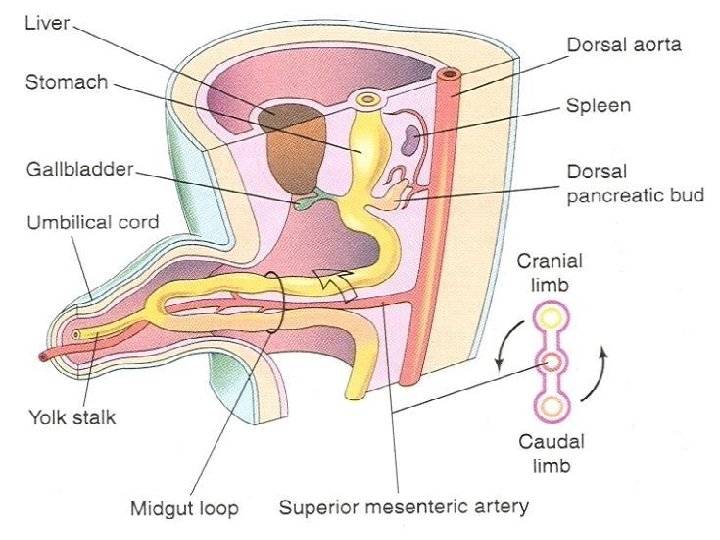 Midgut Ø Umbilical herniation occurs because there is not enough room in the abdomen for the rapidly growing midgut Ø The shortage of space is caused mainly by the relatively massive liver and two sets of kidneys during this stage of development Ø The midgut loop has a cranial limb and a caudal limb Ø Yolk stalk is attached to the apex of the midgut loop where the two limbs join