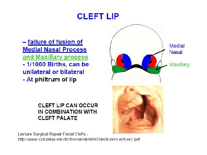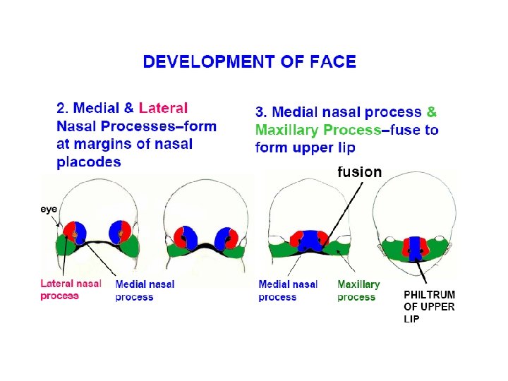 7 th week eye Medial nasal process and maxillary process Upper lip: 2 Medial nasal process 2 processus maxillaris Lower lip: fusion of 2 mandibular process - Nasolacrimal groove: the ectoderm invaginates and form a duct, that is invested by bone during the ossification of the maxilla -fusion of the mandibular and lateral nasal process