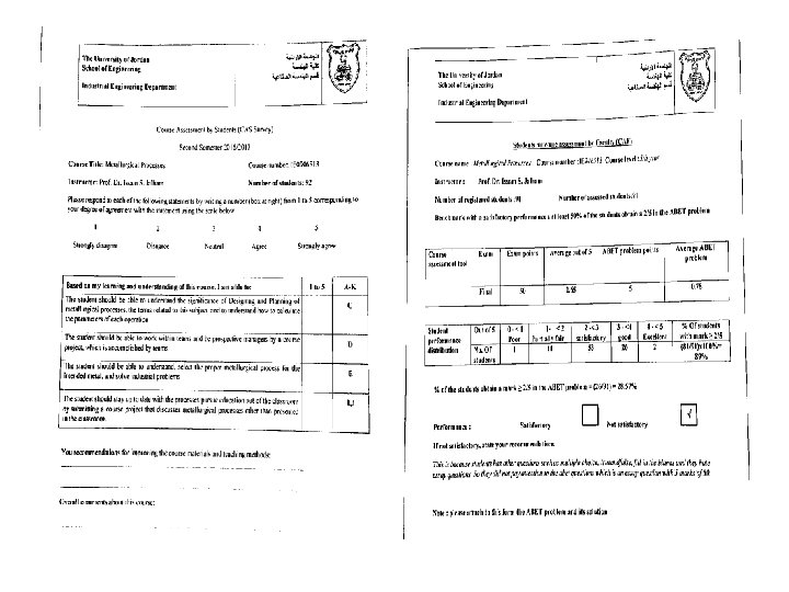 Results and Discussions After the analysis of the results of this study, 37 KPIs Adopted by Stakeholders. These 37 KPIs are shown in Tables 1 -8 below. To be more precise and realistic, each criterion was divided into subcriteria. A KPIs were assigned to each sub-criterion as it is shown in tables 1 -8. As an example, let us take the sub-criterion 2 of criterion 3 (student outcomes) for the course metallurgical processes, offered by the Industrial Engineering Department at the School of Engineering/University of Jordan. As it is indicated, the KPIs are the course assessment by faculty (CAF) and the course assessment by student (CAS). The results are shown in Figure 2 and Figure 3 (a) and (b). These forms are specially designed to suite the courses.
