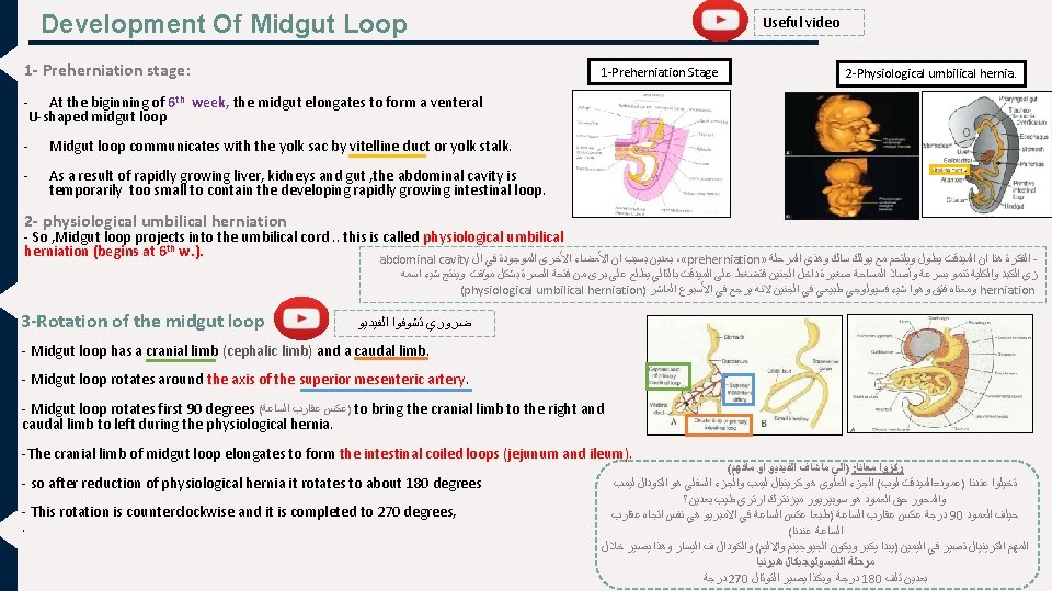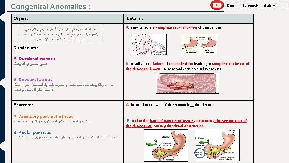 Cont. . -The duodenal loop: 1 -The duodenal loop is formed and projected ventrally, forming a Cshaped loop. 2 -The duodenal loop is rotated with the stomach to the right. (90) degrees 3 - It comes to lie on the posterior abdominal wall retroperitoneally* with the developing pancreas. *except the first small part of duodenum. During 5 th and 6 th weeks, the lumen of the duodenum is temporarily obliterated because of proliferation of its epithelial cells. Normally degeneration of epithelial cells occurs the duodenum normally becomes recanalized by the end of the embryonic period**( end of 8 th week) ﺍﻟﺪﻳﻮﺩﻳﻨﻢ ﻋﺒﺎﺭﺓ ﻋﻦ ﺃﻨﺒﻮﺏ؛ ﻟﺬﻟﻚ ﻓﻲ ﺍﻷﺴﺒﻮﻉ ﺍﻟﺨﺎﻣﺲ ﻭﺍﻟﺴﺎﺩﺱ ﺍﻷﻨﺒﻮﺏ ﻳﺘﺴﺪ ﻭﻳﺘﻘﻔﻞ : ﺍﻟﺨﻼﺻﺔ ** the period from fertilization to the end of 8 th week - Fetal period: from 9 th week to birth ﺑﻌﺪﻳﻦ ﺍﻟﺨﻼﻳﺎ ﺗﺒﺪﺃ ﺗﺘآﻜﻞ ﻭﻣﻊ ﻧﻬﺎﻳﺔ ﺍﻷﺴﺒﻮﻉ ﺍﻟﺜﺎﻣﻦ ، ﻣﻦ ﺍﻟﻮﺳﻂ ﻣﻮﻗﺘﺎ ﺑﺴﺒﺐ ﺗﻜﺎﺛﺮ ﺍﻹﺑﻴﺜﻴﻠﻴﺎﻝ ﺳﻠﺰ ﻳﺮﺟﻊ ﺍﻷﻨﺒﻮﺏ ﻳﻔﺘﺢ ﻣﻦ ﺟﺪﻳﺪ