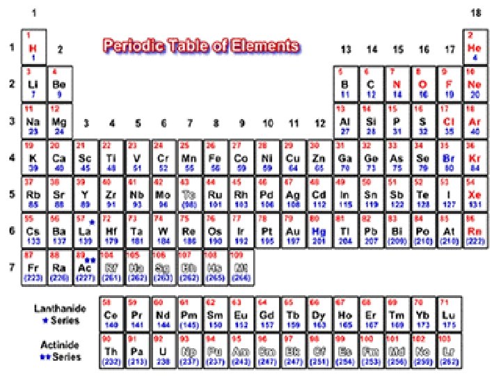 Introduction to the Periodic Table • Elements are arranged in seven horizontal rows, in order of increasing atomic number from left to right and from top to bottom. • Rows are called periods and are numbered from 1 to 7. • Elements with similar chemical properties form vertical columns, called groups, which are numbered from 1 to 18. • Groups 1, 2, and 13 through 18 are the main group elements. • Groups 3 through 12 are in the middle of the periodic table and are the transition elements. • The two rows of 14 elements at the bottom of the periodic are the lanthanides and actinides.