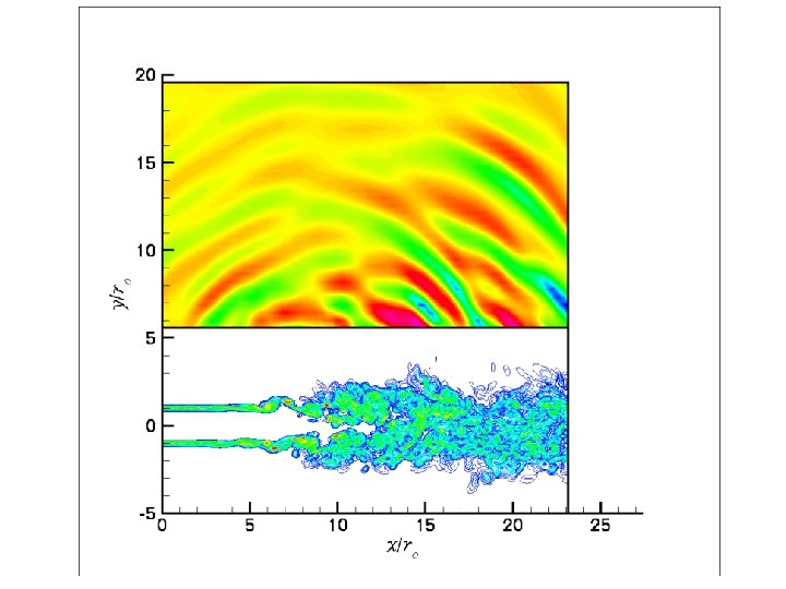 Computation Details • Physical domain length of 60 ro in streamwise direction • Domain width and height are 40 ro • 470 x 160 (12 million) grid points • Coarsest grid resolution: 170 times the local Kolmogorov length scale • One month of run time on an IBM-SP using 160 processors to run 170, 000 time steps • Can do the same simulation on the Compaq Alphaserver Cluster at Pittsburgh Supercomputing Center in 10 days