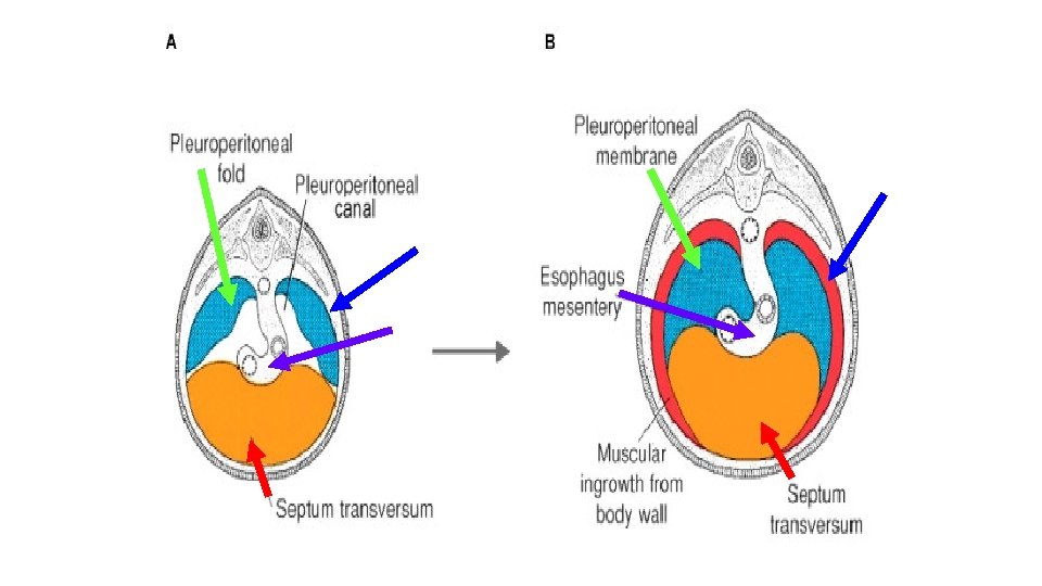 Pleuro-peritoneal membranes grow medially from body wall they encroach on pleuroperitoneal canals till fuse with septum transversum anterior to esophagus And the esophageal mesentery posterior to it