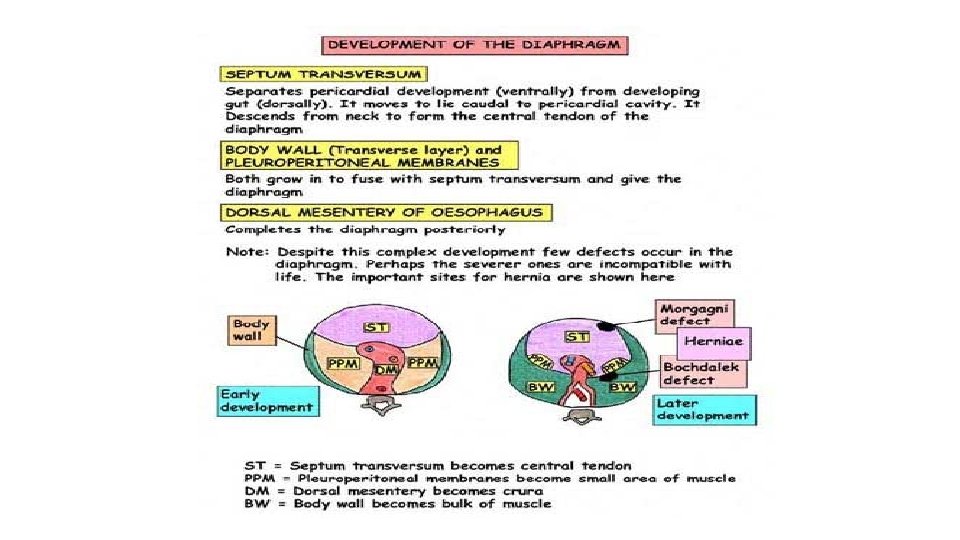 Congenital diaphragmatic hernia Herniation of abdominal contents into pleural cavity due to failure of development of pleuroperitoneal membrane