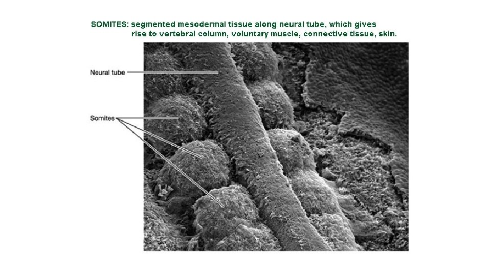 Paraxial mesoderm • Gives rise to somitomeres in the head region • Gives rise to somites in postcranial region Somite differentiate into Scelerotome (ventromedially) forms bones of axial sceleton Dermomyotome (dorsolaterally) dermatomte (dermis) myotome (skeletal muscles)