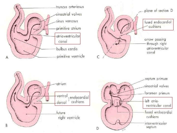 n Partitioning of Heart Chambers (from 27 th day to 37 th day) u Partitioning of atrioventricular canal u Partitioning of the primitive atrium u Partitioning of the primitive ventricle u Division of truncus arteriosus and bulbus cordis