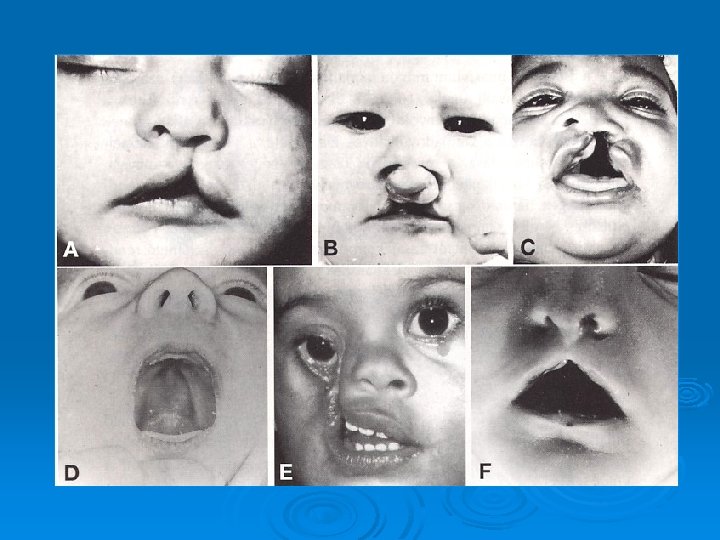 Malformations Median cleft Macrostomia Cleft of inferior lip Microstomia Obligue facial cleft Bifid nose and incomplete median cleft