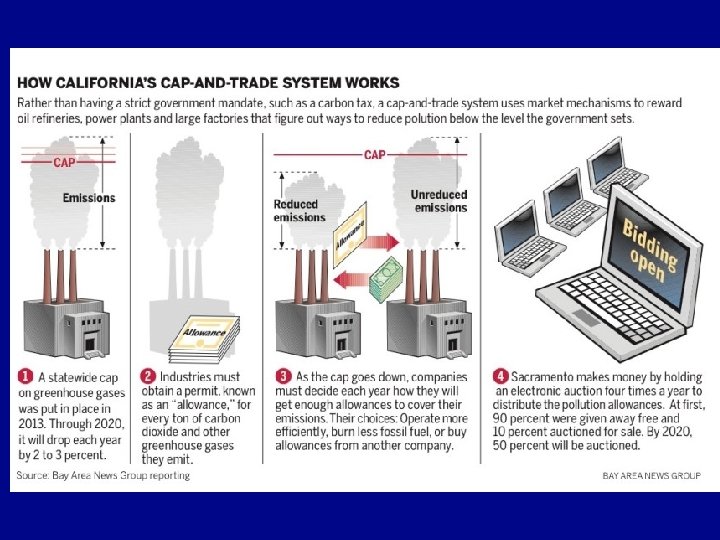 Sustainability Question? How do we reduce pollution? (to leave a cleaner Earth for future generations) • Recycling (pollution control starts at home) – “Think globally, Act locally” • Reduce throwaway/non-biodegradable packaging • No more styrofoam, strays, plastic bags, 6 -pack holders • “cap and trade” or “emissions trading” • uses a market concept • polluters given allowances to pollute by a govt. agency – Markets formed to buy unused allowances from those who don’t use them – Sold to those who wish to pollute more than their allowance. – Industries most able and willing to reduce pollution will do so and profit from their surplus credits • Therefore, pollution reduction is incentivized! – it rewards companies to pollute less – Increases costs/punishes those who pollute more