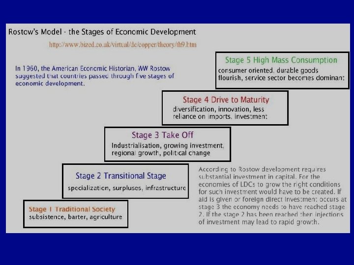 Paths to Development? • International Trade Model/Rostow’s model of development – Five stages • Traditional society • Preconditions to “take-off” – elite, well-educated (usually in West) take lead – identify assets to exploit (raw material, cheap labor, etc. ) – investment in new technology and infrastructure (transportation, clean water systems, etc. ) – hope to stimulate PRODUCTVITY
