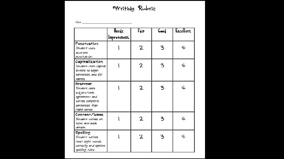 Quality criteria should… 1. Allow teachers to infer development. Don’t count (e. g. some, many) • counts don’t show quality • they discourage students from experimenting • it isn’t true that more of something means higher quality • e. g. spelling rubrics that have “no words spelt incorrectly” can make students just use easy words