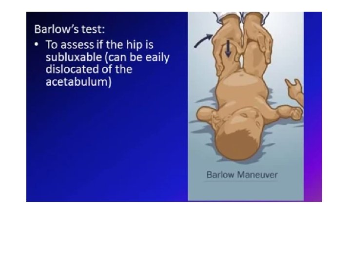 • How to assess : • a. Positive Barlows test: ( Ortolan’s sign) click heard on abduction of thighs. • b. Shorting of limb on the affected side. • c. Asymmetrical thigh and gluteal folds. • d. Restriction of abduction. • e. After walking begins waddling gait in (bilateral) or limping in (unilateral).