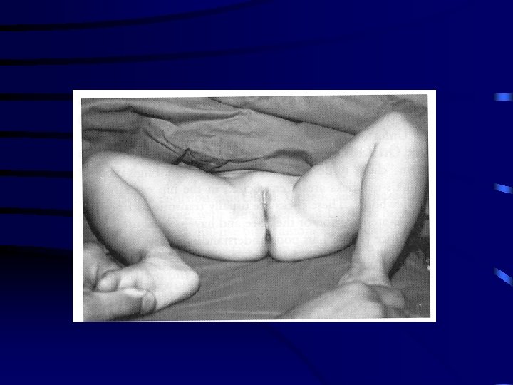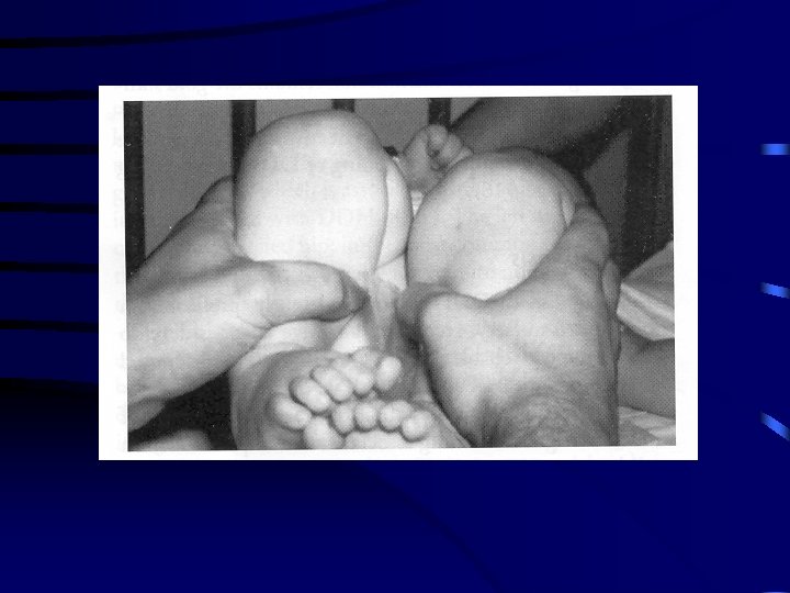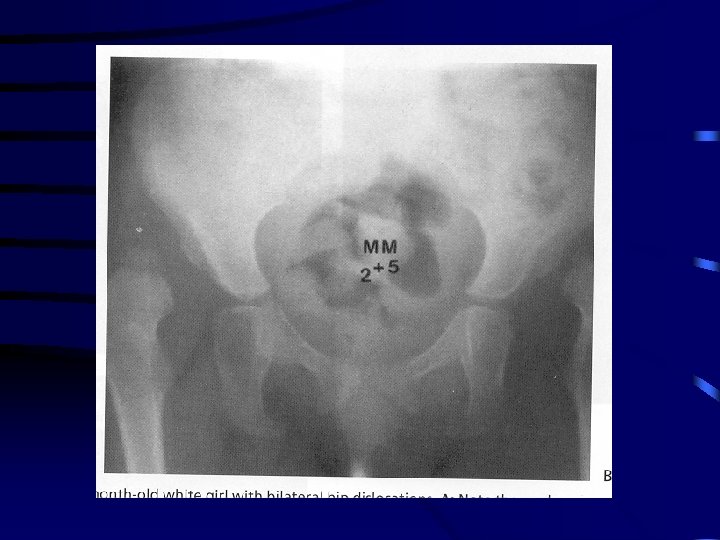 Etiology • Genetic and ethnic • increased native Americans but very low in southern Chinese and Africans • positive family history 12 -33% • 10 x risk if affected parent, 7 X if sibling • intrauterine factors – breech position ( normal pop’n 2 -4% , DDH 17 -23% ) – oligohydroamnios – neuromuscular conditions like myelomeningocele • high association with intrauterine molding abnormalities including metatarsus adductus and torticollis • first born • female baby ( 80% cases) • left hip more common