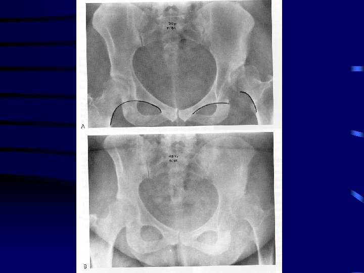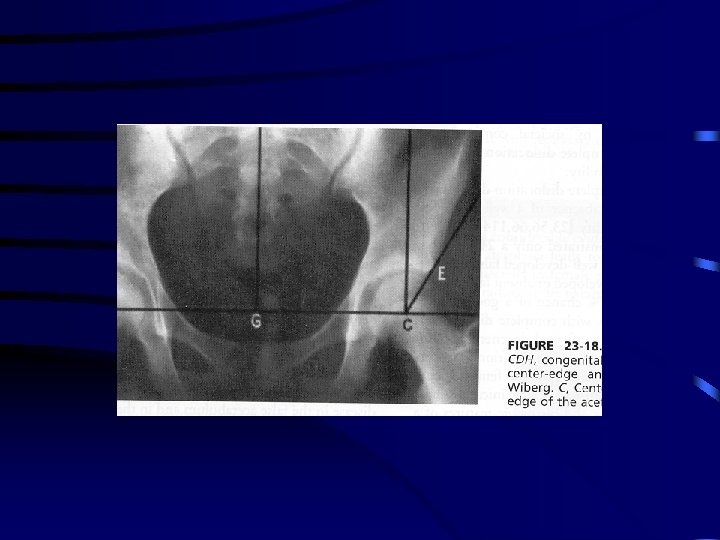 Radiological Diagnosis • classic features – increased acetabular index ( n=27, >30 -35 dysplasia) – disruption shenton line ( after age 3 -4 should be intact on all views) – absent tear drop sign – delayed appearance ossific nucleus and decreased femoral head coverage – failure medial metaphyseal beak of proximal femur , secondary ossification center to be located in lower inner quadrant – center-edge angle useful after age 5 ( < 20) when can see ossific nucleus