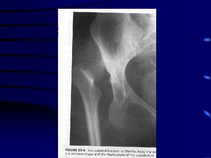 Adults • Variable • depends on 2 factors – well developed false acetabulum ( 24 % chance good result vs 52 % if absent) – bilaterality • in absence of false acetabulum patients maintain good ROM with little disability • femoral head covered with thick elongated capsule • false acetabulum increases chances degenerative joint disease • hyperlordosis of lumbar spine assoc with back pain • unilateral dislocation has problems – leg length inequality, knee deformity , scoliosis and gait disturbance