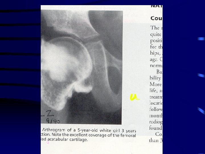 Natural Sequelae • Goal of treatment is to have radiographically normal hip at maturity to prevent DJD • after reduction achieved potential for development continues until age 4 after which potential decreases • child < 4 minimal dysplasia may observe but if severe than subluxations and residual dysplasias shoild be corrected • when evaluating persistent dysplasia look at femur and acetabulum • DDH deficiency usually acetabular side