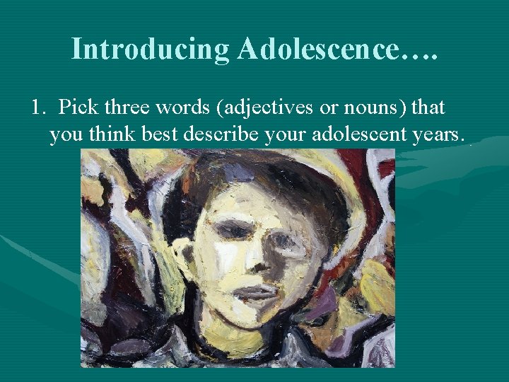 Introducing Adolescence…. 1. Pick three words (adjectives or nouns) that you think best describe your adolescent years.