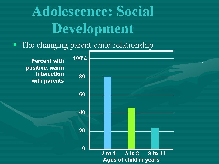 Adolescence: Social Development § The changing parent-child relationship Percent with positive, warm interaction with parents 100% 80 60 40 20 0 2 to 4 5 to 8 9 to 11 Ages of child in years