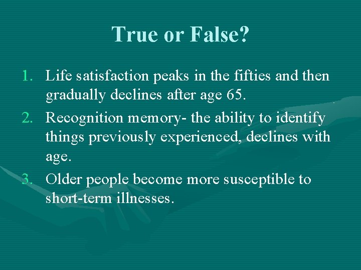 True or False? 1. Life satisfaction peaks in the fifties and then gradually declines after age 65. 2. Recognition memory- the ability to identify things previously experienced, declines with age. 3. Older people become more susceptible to short-term illnesses.